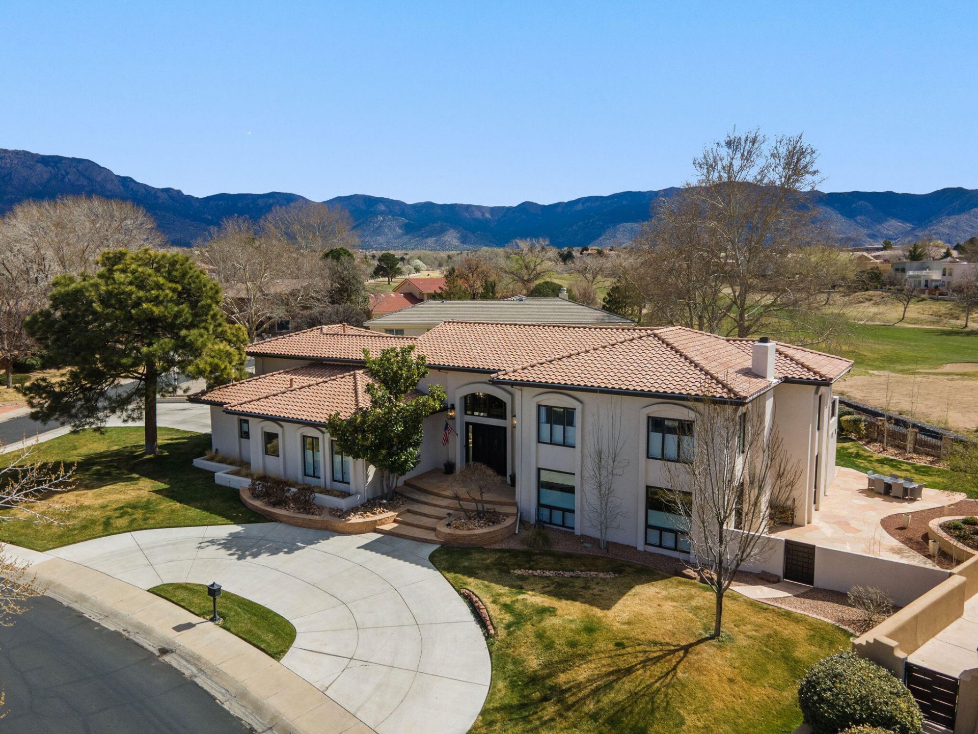 Welcome to 9915 Tanoan Dr. NE, an exceptional luxury residence located inside the prestigious gated Tanoan West Country Club community. Perfectly positioned on an expansive nearly half-acre lot backing directly to the Tanoan golf course, this beautifully updated 5,898 sq ft two-story estate offers the perfect blend of elegance, modern upgrades, and resort-style outdoor living.This impressive home features 4 spacious bedrooms, a private office, multiple living areas, and soaring architectural details throughout. From the moment you step through the grand entryway, you're greeted by dramatic vaulted ceilings, expansive windows, and beautiful hardwood flooring that create an immediate sense of sophistication and scale.